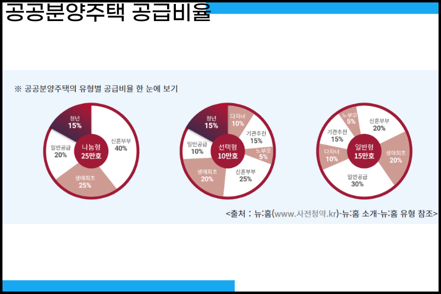 - 특별공급 : 신혼부부, 다자녀가구 , 생애최초 주택구입자 등을 위한 공급